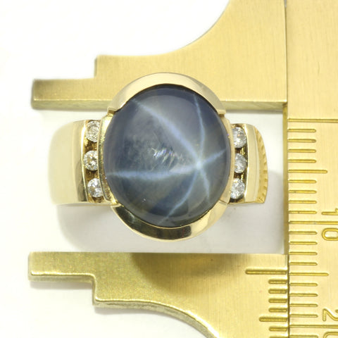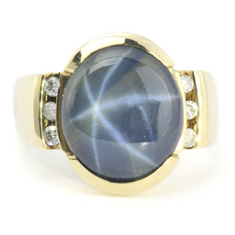 This handsome blue-grey sapphire, the color of winter seas and distant mountains, boasts an extremely mobile six-pointed star. The stone sits low and close in a half-bezel setting, flanked by two rows of channel-set diamonds. The broad band and simple yet elegant style give an air of gravitas and maturity to this ring.